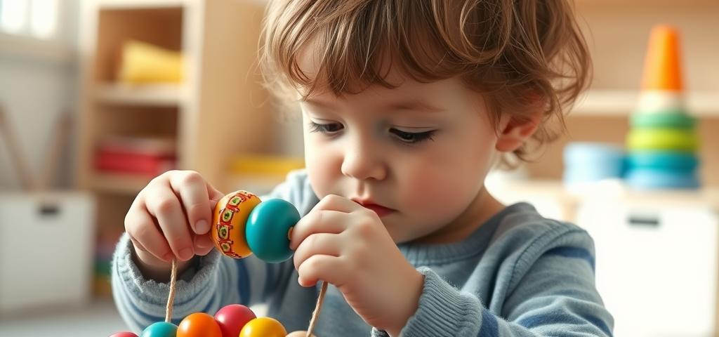 • Fädelspiele: Auffädeln von Perlen unterschiedlicher Größe auf verschiedene Schnüre zur Förderung des Pinzettengriffs (Daumen-Zeigefinger-Griff) und der Auge-Hand-Koordination.